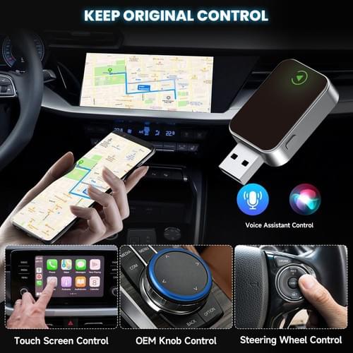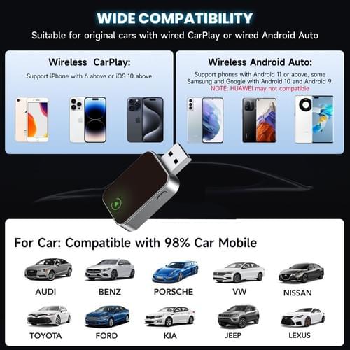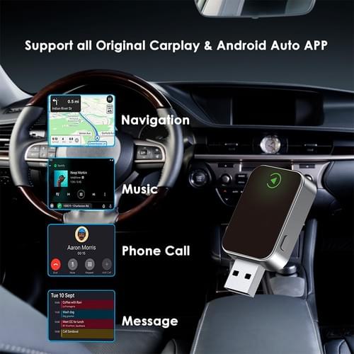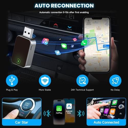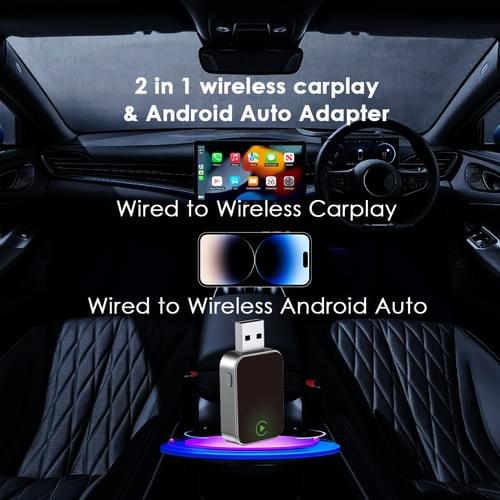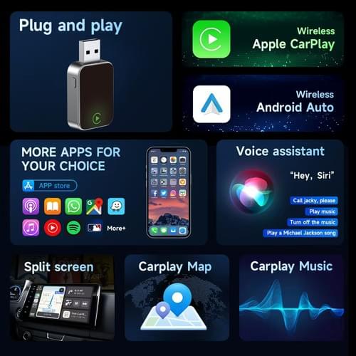 Produk ini adalah perangkat portable wireless yang memungkinkan Anda menghubungkan smartphone iPhone atau Android ke sistem multimedia mobil Anda tanpa kabel, meskipun head unit bawaan mobil Anda hanya mendukung koneksi kabel. Dengan perangkat ini, Anda dapat menikmati fungsi Apple CarPlay dan Android Auto secara nirkabel untuk pengalaman berkendara yang lebih modern dan nyaman.